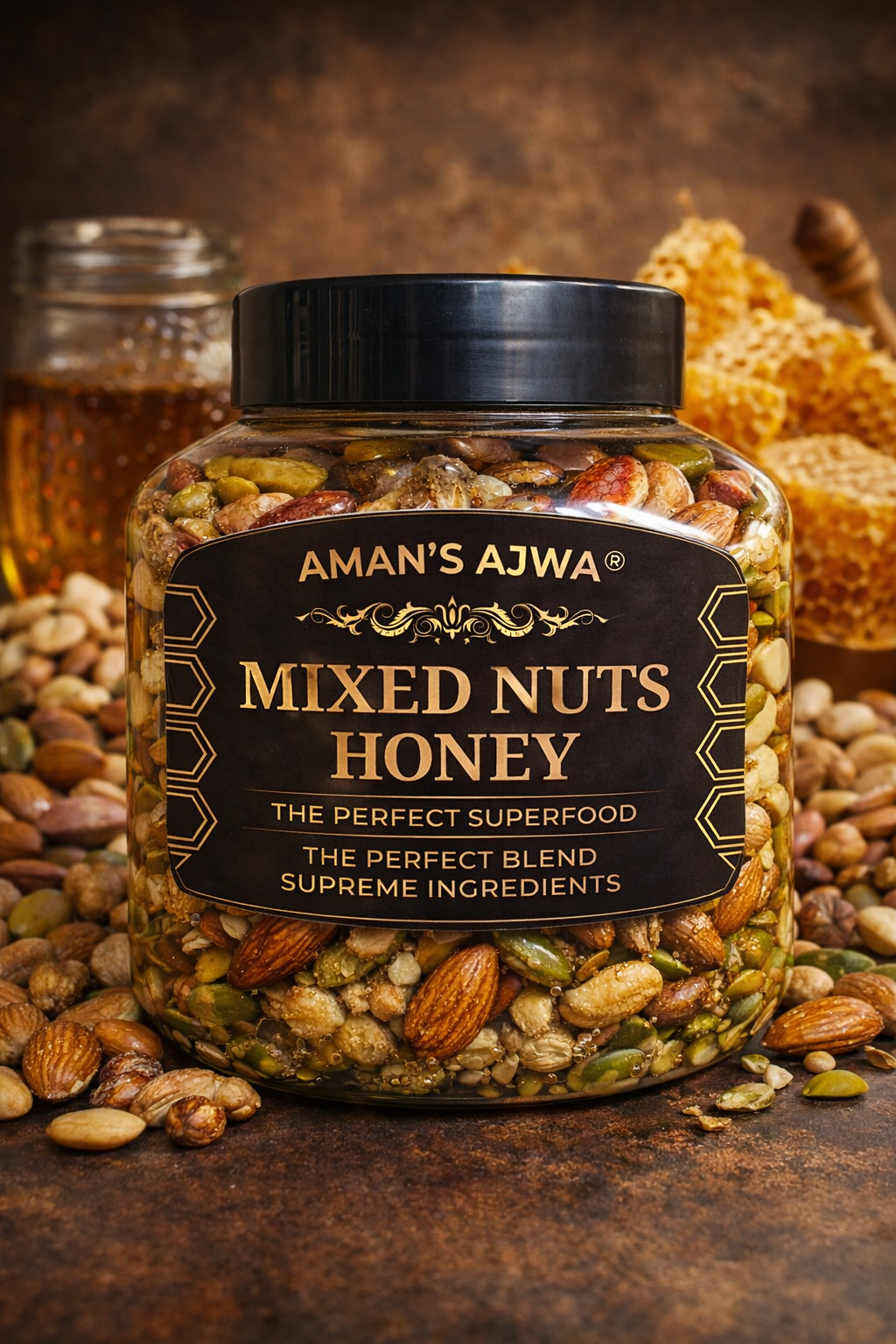 Mixed Nuts Honey is a powerful blend of premium nuts soaked in pure honey, rich in natural energy, healthy fats, and essential nutrients.
